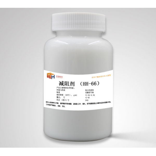 江阴华恒助剂有限公司研发的成品油减阻剂(HH-66)是梳状聚a-烯烃减阻剂,该产品为聚合物粉末分散在有机醇中,形成浆状产品,便于产品的注入。当该产品注入到成品油中,聚合物粉末能快速溶解在成品油中,聚合物舒展成长碳链梳状聚合物,有效地改变了流体的形状,降低了湍流的形成,减少了流体运动过程中能量的消耗,减少了流体在管道运动的阻力。当输油管线的输量恒定时,可以降低管线的压力。当输油管线压力恒定时,可以提高管线的输油量。在加量为5-60ppm的范围内可以有效地降低管线的阻力,提高管线的输送能力,提高管线的输油经济效益。该产品凝点低,适应于在低温环境下注入使用,该产品挥发性小,环保安全。